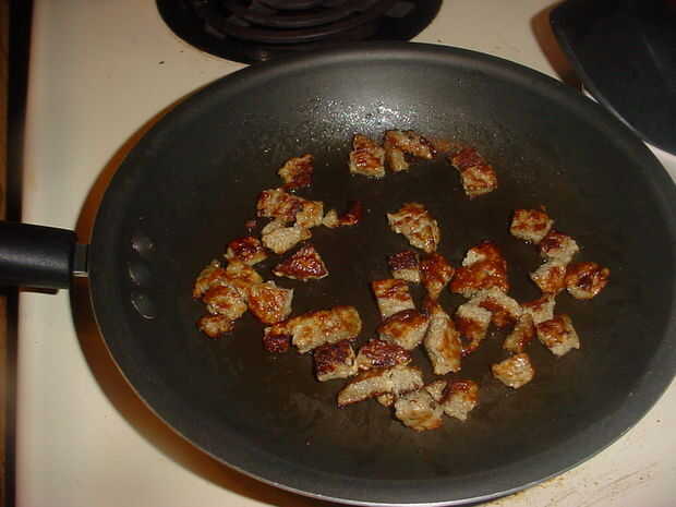corte o rotura hasta la salchicha y ponerlo en la sartén a calentar a través de, un poco de grasa de tocino en este punto ayuda a dorar la salchicha