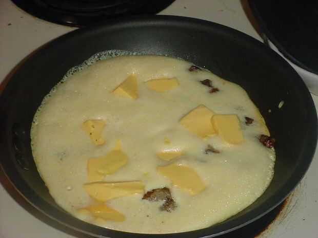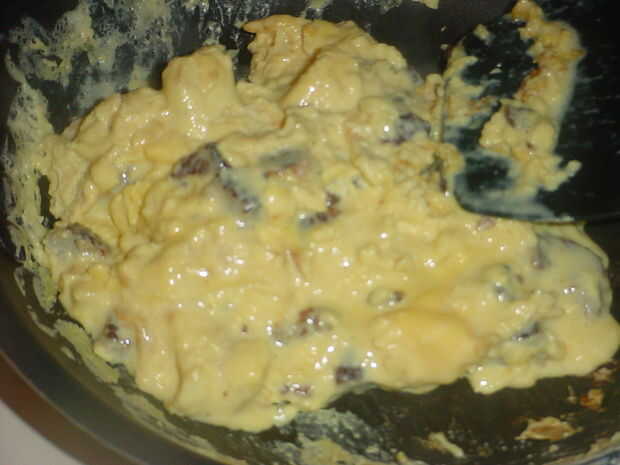 Vierta la mezcla de huevo ya batido en la sartén medio caliente y rapidez en su queso, trozos el queso lo ayudará derretir y mezclar más rápido. Deje que una acerca de un minuto y luego comienza a revolver y mezclar con la espátula o cuchara de madera. Parada y retire los huevos de la sartén mientras que todavía se ven un poco suave y bajo cocido, el calor residual será acabar con ellos solo bien. Si los cocinas hasta que parecen hacer, será exagerados cuando vayas a comer