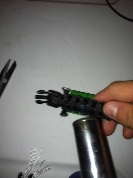 esta pulsera utiliza la armadura de paracord tradicional sólo diferentesPaso 1: materiales Más ligero4' de cada colorUna hebillaTijerasPaso 2: Preparando el Paracord Corte y quema al final de un color a un punto finoAproximadamente una pulgada de otr