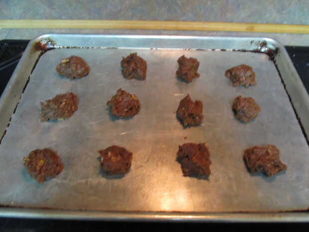 8. colocar la masa por cucharadas redondeadas en una hoja para galletas sin enmantecar (me gusta rocíe sólo para estar seguro)