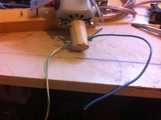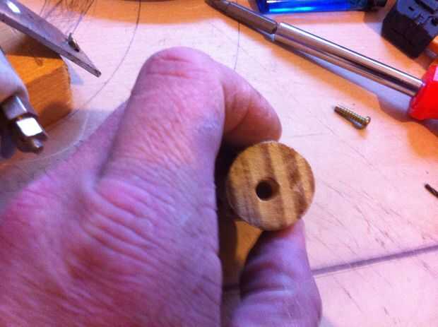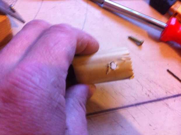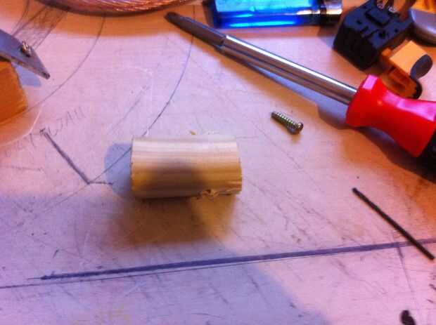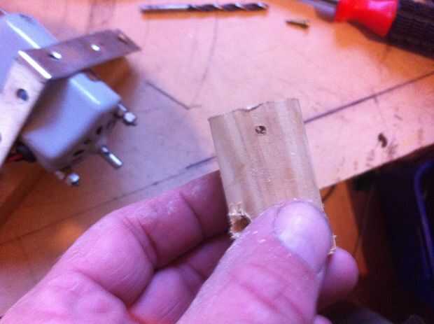luego perforé un agujero en la parte superior de la chatarra del pedacito de palo de escoba por el lado de un agujero más pequeño para un tornillo de ajuste, esto mantendrá el desecho de escoba al motor, luego en el otro extremo taladré un agujero directamente a través del cable conectar a.