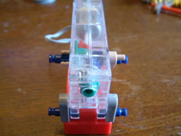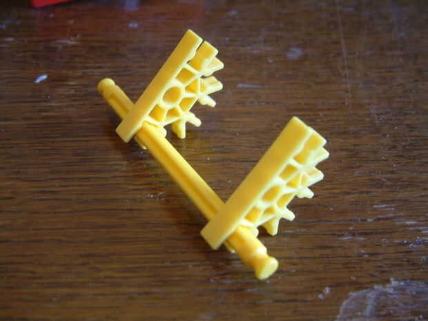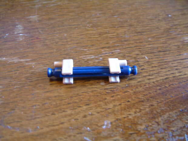 2. apretar una barra azul a través del eje horizontal y en un clip tan ambos lados (Asegúrese de que están en lados opuestos de la barra) y luego presione 2 ruedas pequeñas.