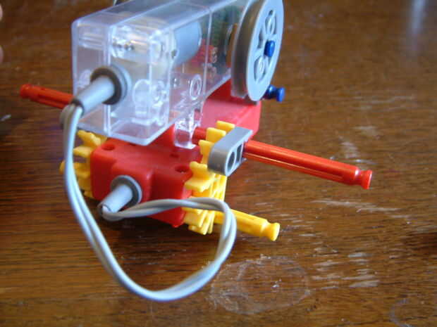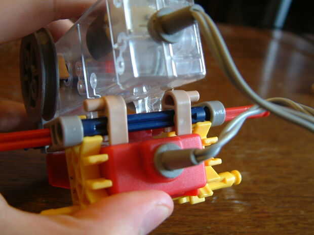 1. Tome una barra azul y pase por los orificios de la unidad de motor y la batería, arreglar esto en su lugar con 2 conectores gris oscuros en los extremos.