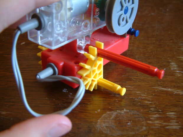 4. Deslice una barra roja los lazos posteriores de las carcasas del motor y la batería. Ahora recorta lo que usted acaba de hacer en la varilla, con un conector amarillo cada lado en la orientación que se muestra.