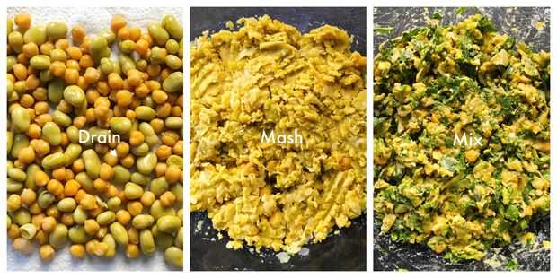 Drenan sus garbanzos y habas y enjuague bajo agua fría para eliminar la salmuera. Dejarlos unos minutos para que se seque, o preferiblemente los pop sobre una toalla de cocina para absorber cualquier exceso de agua. Cuando estés listo, pegarlas en un tazón.