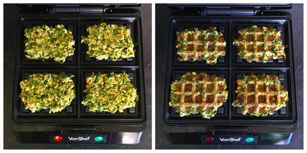 Cierre la tapa y programar un temporizador durante diez minutos. Puede ver después de las cinco para ver cómo van las cosas, pero bajo ninguna circunstancia abren la tapa antes de esto o corre el riesgo de todo cayendo a pedazos. No sólo la comida, pero sus esperanzas y sueños. Usted sabrá que los wafalafels están listos cuando están ligeramente doradas y firmes al tacto.