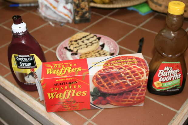 Yep, that's right! Este pastel está construida de waffles de Chocolate Chip que se han bañado en chocolate de leche y bañadas en de nuevo "Chocolate con leche crema queso Philadelphia". Normalmente no me gusta tomar atajos. Habría hecho los gof