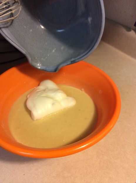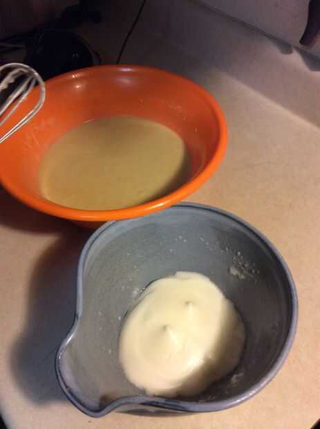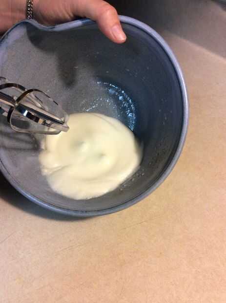 a continuación, agregue los huevos blancos con mezcladora automática hasta forma picos rígidos; pliegue en masa.