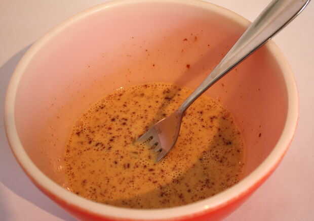 en un recipiente grande combinar unos batidos de la canela y splash de vainilla, 2 huevos y leche.