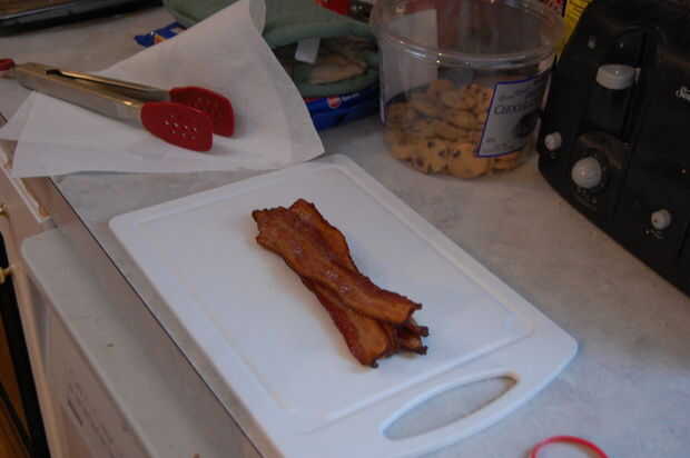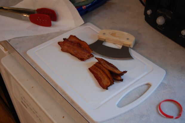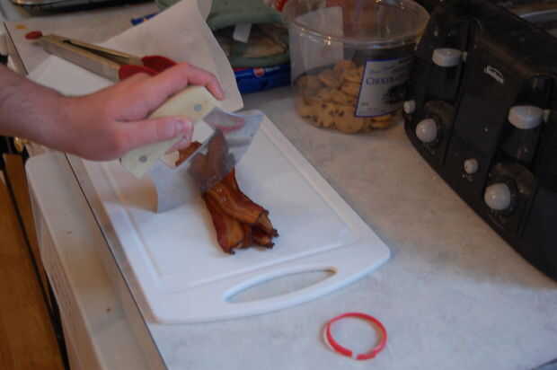 Retire el tocino del horno y colocar el número de tiras que necesitas en una tabla de cortar (2 tiras de completas por galleta).