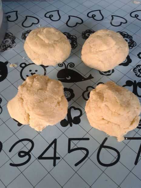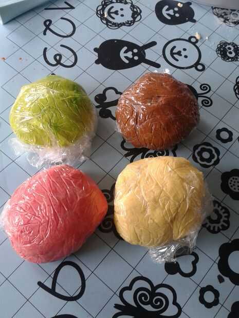 Combinar la mantequilla con el azúcar y la vainilla azucarada. Añadir el huevo y la harina y mezclar bien. Dividir la masa en 4 secciones. Añadir un poco de comida para colorear en cada sección y mezclar. Forma la masa en bolas y coloque la masa en el refrigerador por 3 horas.