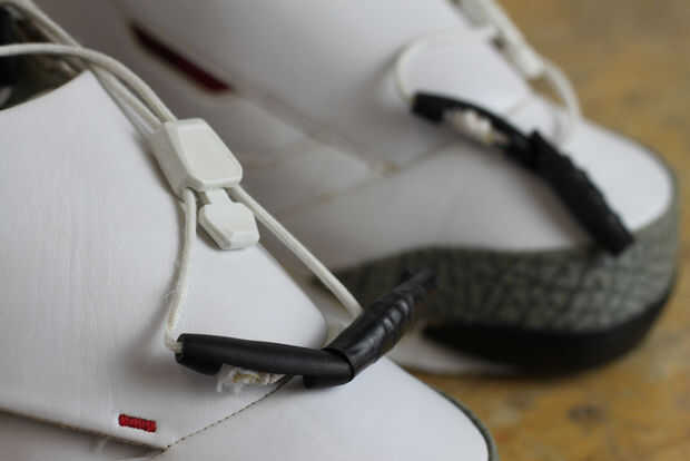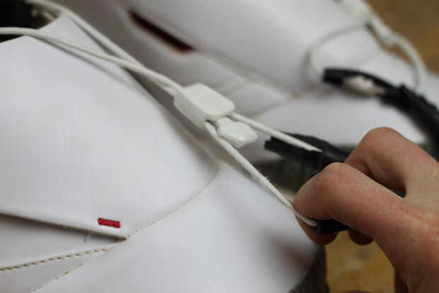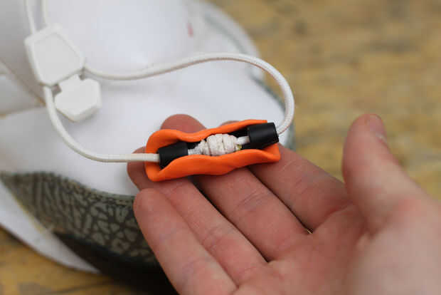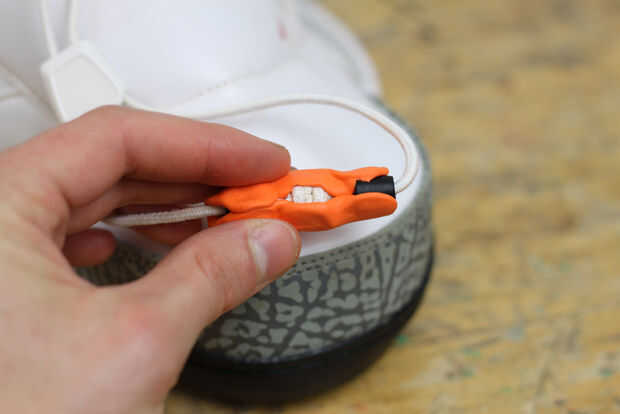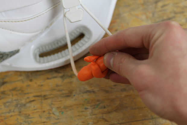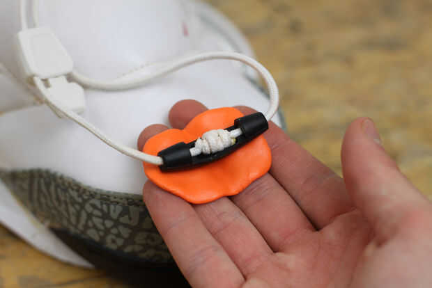 Comenzamos con los cierres de encaje. Tom estaban todos rotos y rotas y no muy cómodo por lo que decidimos cambiar esto. Para hacer los agarres mejor posible con la menor cantidad de sugru decidimos hacer en dos partes.