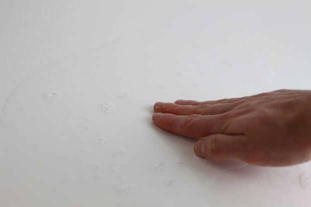 Para conseguir una base uniforme y plana poner agua jabonosa sobre una superficie plana lisa, colocar el elevador de la Unión hacia abajo y movió suavemente sobre la superficie. Esto da una base uniformemente plana a la sugru. Tenga cuidado de no aplicar demasiada presión a la Unión, sólo quieres aplanarla, no calabaza la sugru.