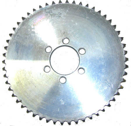 Tomar la rueda dentada de 54 diente y fije el extremo del eje del carrete. El carrete de manguera que tenía la misma punta roscada como una brida de piso, por lo que tenemos que rosca en el extremo, soldados sobre, entonces soldado con autógena un pedazo del metal de hoja (parte de la vieja muestra calle, circular, radio más pequeño y el piñón). A continuación atamos el piñón para que el metal con 6 pernos, arandelas y tuercas. Esta manera, puede insertar las arandelas como usted por favor para enderezar la rueda dentada. Este paso es crucial y si la rueda dentada no es casi perfectamente centrada, la cadena aparecerá off cuando se pone alguna tensión en él.