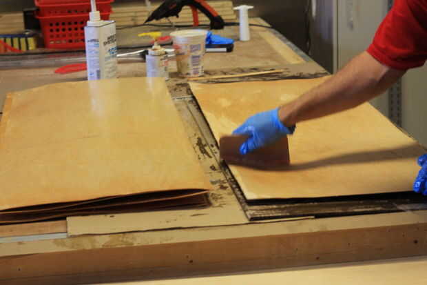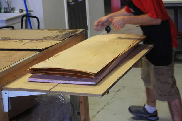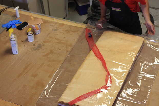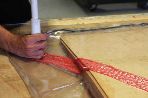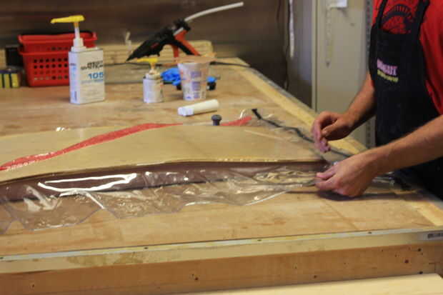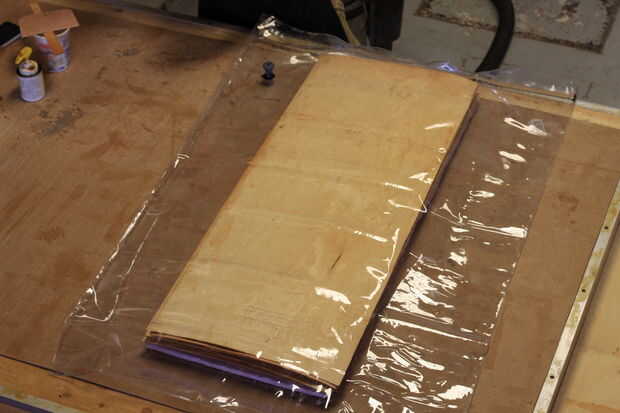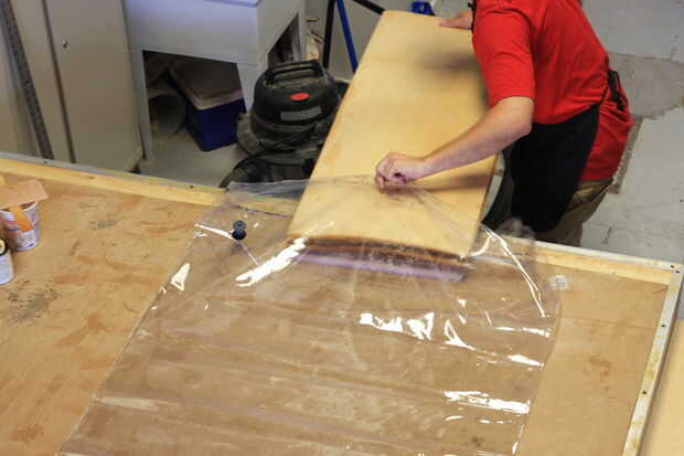 Extienda uniformemente la resina de epoxy mezclado con una llana adhesivo en ambos lados de cada capa de chapa. Cuando todas las capas han sido revestidos, el proyecto puede Coloque en el molde y poner en la bolsa para vacío. Colocar la malla de ventilación debajo de la válvula en su bolsa de grifo y asegúrese de que se ejecute en el proyecto. Esto ayudará a que el aire uniformemente evacuar de la bolsa.