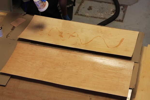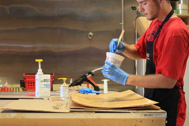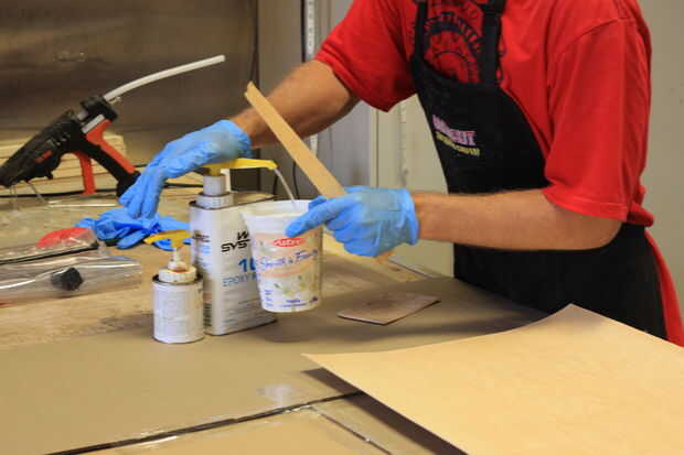 ** Porque wakeskates se utilizan exclusivamente en el agua, es una buena idea utilizar un epóxico para adherir y proteger las capas de chapa. Hacer una investigación sobre qué productos están disponibles localmente y siempre siga las instrucciones en el producto que está utilizando. Muchas resinas epoxi 2 partes tiene diferentes proporciones de resina a endurecedor, por lo que es muy importante seguir las indicaciones.