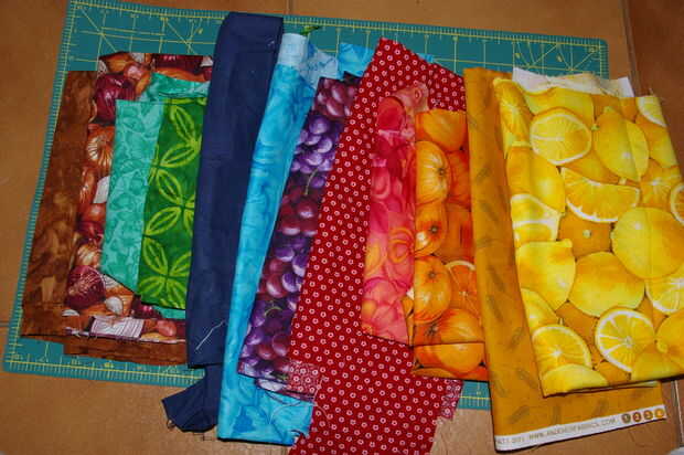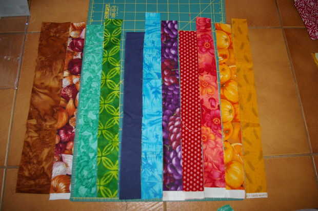 He escogido colores que se corresponden con mi paquete de solicitadas de lápices. El primer paso es cortar tiras de 1,5 pulgadas entre 14-17 pulgadas largo de todos los colores de central y 2,5 pulgadas tiras de la misma longitud de los colores de dos extremos (marrón oscuro y amarillo limón). He hecho todos mis tiras de longitud diferente porque me gusta el efecto de horizonte casi. Sin embargo esto no es necesario así que no dude en hacerlos una longitud uniforme, mientras que la longitud en el perímetro de 14 a 17 pulgadas.