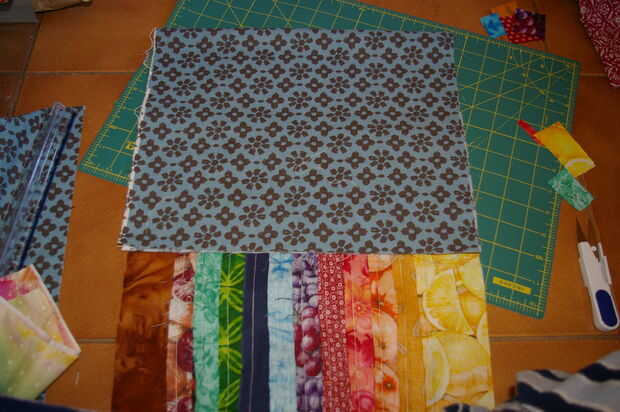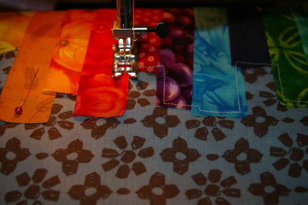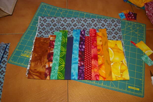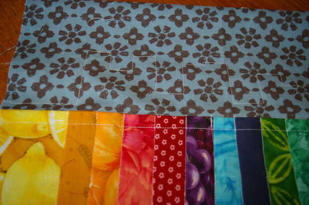 Una vez que todos han sido creados los bolsillos voltear para que los bolsillos están hacia abajo con la tela sobrante de forro en la parte superior. Ahora doblar el resto de la tela del forro hacia abajo por lo que cumple con la parte inferior de los bolsillos. Levante el resto de las tiras y pin en su lugar. En este punto Asegúrese de que la tira más corta es definitivamente mayor que el dobladillo de los bolsillos del otro lado.  Tras el "skyline" de la puntada ahora recta tiras o zig zag para asegurarlos. Sólo debes coser a través de 3 capas (la tira, 2 x el forro). Recuerde que usted podrá ver el reverso de esta costura en el interior de la envoltura (como se muestra en la imagen). Si molestaba podría cambiar el hilo de la canilla a una coordinación con la tela de forro para hacer menos visibles.
