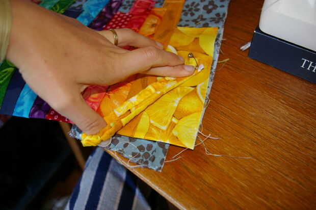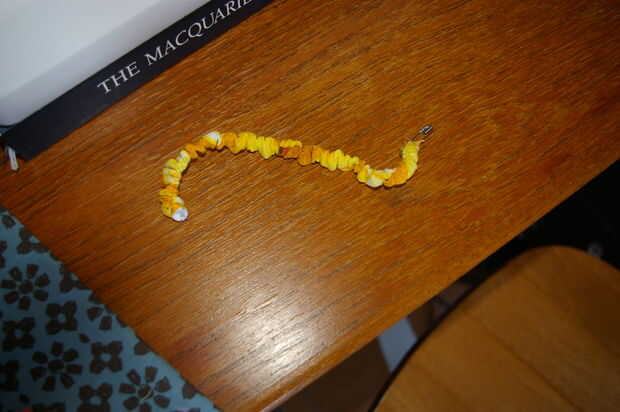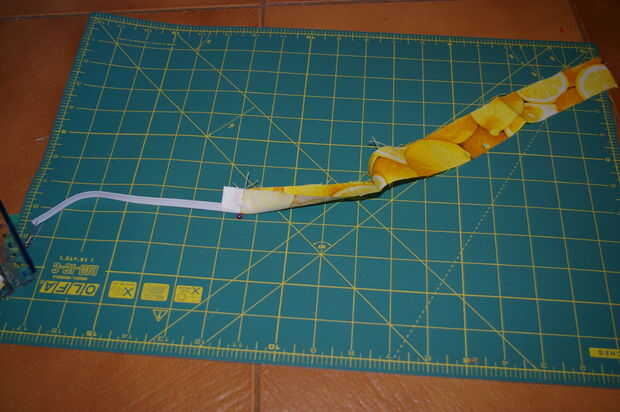 El cabello se hace con una tira de tela, he utilizado un trozo del amarillo porque lo tenía sentado pero se puede utilizar cualquier tela que empareja y aproximadamente 6 pulgadas de elástico, pero básicamente un confortable ajuste alrededor de su montón de lápices. He encontrado más sencilla garantizar uno de los extremos del elástico en la costura del final del tubo de tela que hacen y ponga un alfiler en el otro extremo del elástico para evitar que se pierda una vez que el tubo ha sido resultó derecha. Ambos extremos de su cabello hasta el borde de uno de los extremos, poner en el exterior (no el lado del bolsillo) asegurando que se puede tirar a buena distancia de la esquina para que eventualmente se puede tirar sobre los lápices.