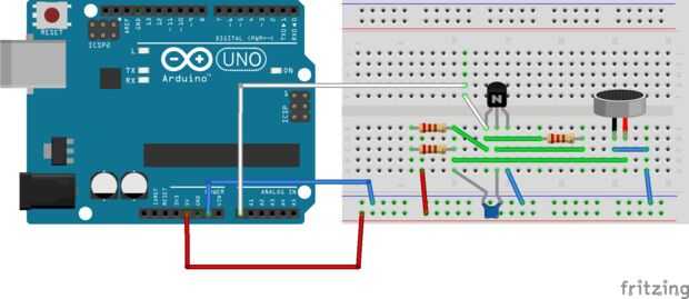 Estos micrófonos electret tienen un diafragma flexible en el interior que se mueve en la onda de sonido que les llega. El diafragma es paralelo a otra placa conductora que genera un condensador con capacitancia variable basada en la flexión de la membrana y posteriormente la onda de presión de sonido que el micrófono está recogiendo. Con el micrófono conectado al circuito de la manera que sea, va a producir una corriente en la base del transistor basado en la onda de sonido golpeando el micrófono de la CA. Se amplifica la corriente base del transistor y por eso tenemos una onda de sonido amplificada que estamos alimentando a nuestro microcontrolador.