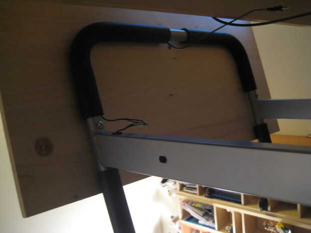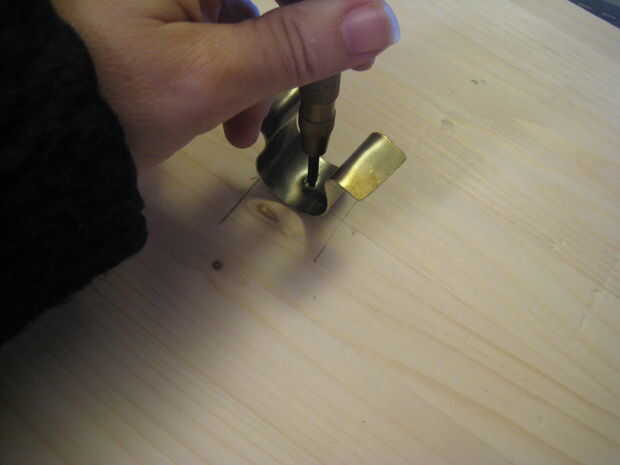 Fije los soportes con tornillos para madera corta. (Asegúrese de escoger un tornillo para madera que es más corto que el grueso de la madera, o tendrá algo puntiagudo dolorosa que sale de su mesa.) (Suena como una maniobra de novato, pero realmente cometí este error, ¡ d ' oh)