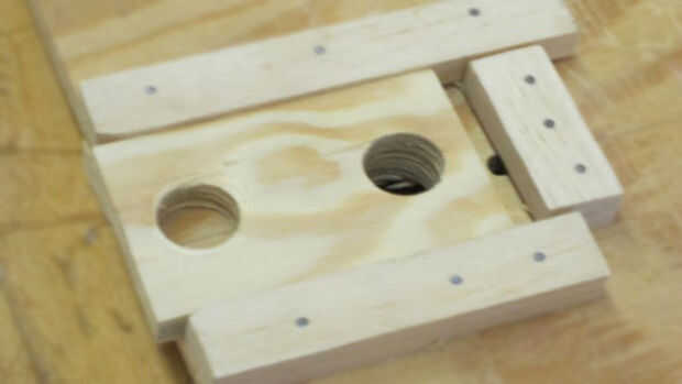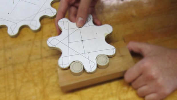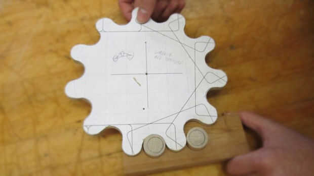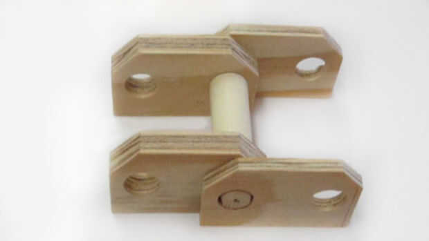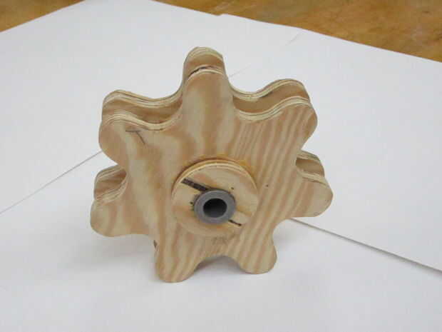 Primero comencé con un troquel para ambos engranajes y luego genera dos engranajes para cada pistas. Después de eso, he creado una plantilla para cortar y perforar la 1/4 y 1/2 en enlaces de madera contrachapada. Pienso montar un tubo de PVC en una clavija de madera para separadores. Después de crear un marco, todas las piezas fueron puestas juntos y ha trabajado muy bien.