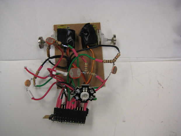 Caliente-pegado de los servos en la cartulina base y arregló los sensores para estar arriba, derecha, izquierda o frontal del robot. Entonces creé 'paredes' de la caja de cartón más. Corte los agujeros para sensores de luz y engranajes. La parte superior de mi robot es solo un pedazo de papel!