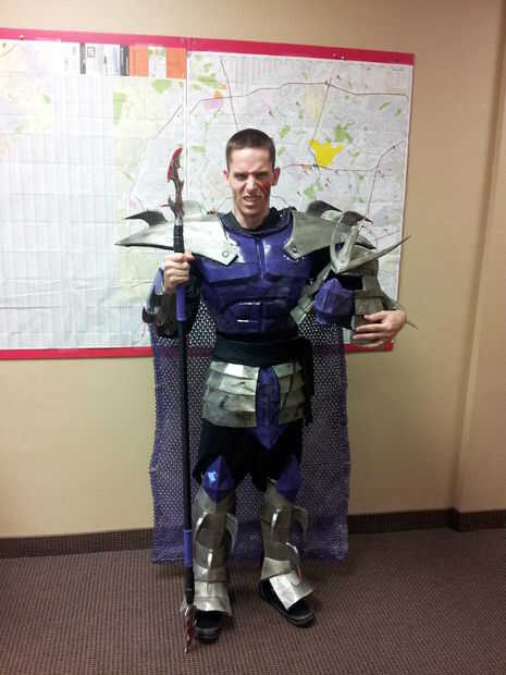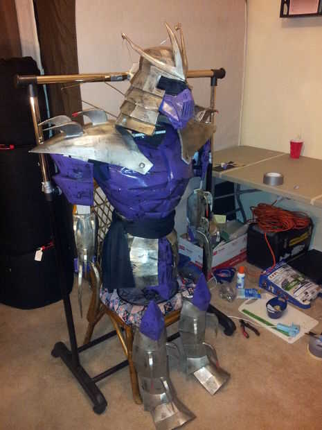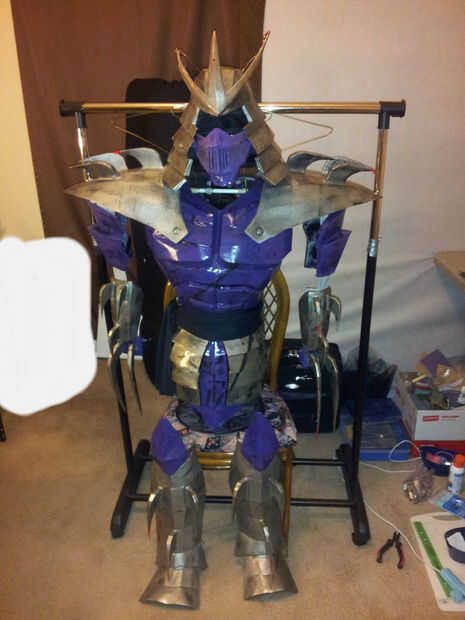 Finalmente he añadido algunos toques finales al traje. He hecho un arma de una espada de doble filo mano que conseguí en la tienda de dólar. Corté el arma por la mitad y poner una mitad de la arma en ambos extremos de una escoba mango. Entonces utilicé hilo negro para envolver el mango de la escoba. Utilicé cable 550 púrpura envuelto alrededor de la sección dos de la arma para la colocación de la mano. Hice una última conexión con el traje de la comprobación de todo para asegurarse de que ajuste correctamente. Utilicé tiras de Velcro para sujetar las piezas de la pierna, brazo, hombro y pecho. Después de que estaba preparado para Halloween.!