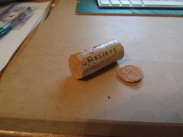 Con el cuchillo corte la parte que tiene el vino (si el corcho es nuevo omitir este paso). Dibuja un círculo en ambos lados del corcho cortado para obtener un ligero descenso. Dibujar 2 líneas gruesas en el corcho (aquí es donde pones la tira de cuero o sting) corte entonces hacia fuera suficiente para la cadena o faja pero no demasiado porque puede romper la ti.