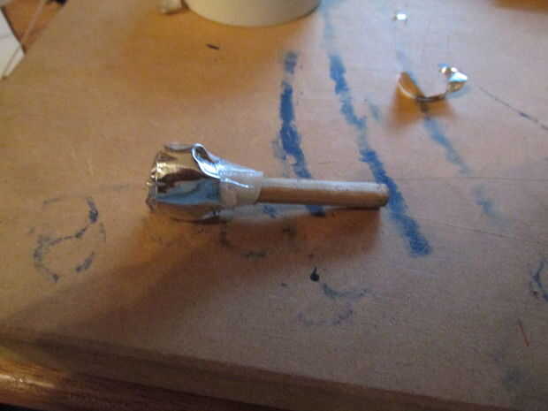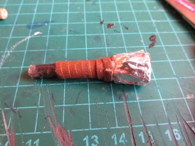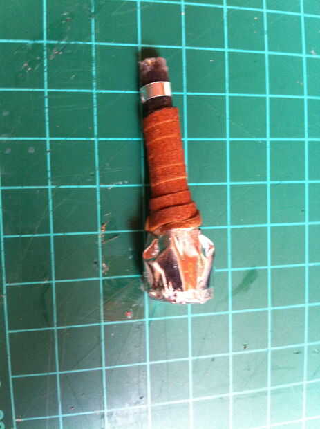 Cortar un palo que es aproximadamente 2 pulgadas de largo. Papel hacer un cono de igual forma en la parte inferior de la palanca luego pintarla o cubrirla con aluminio. Entonces obtener la tira de cuero o picadura y Envuélvala alrededor de la palanca, pintar la parte sobrante del palo negro y poner una punta de aluminio en la parte media.