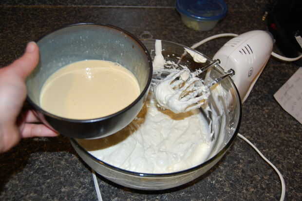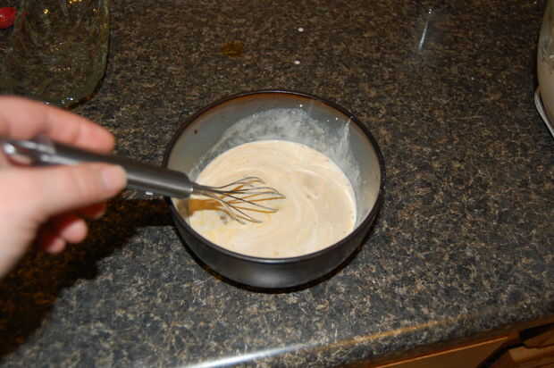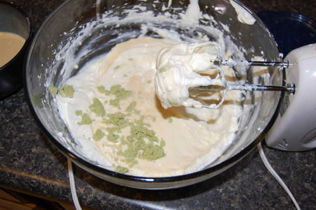 Mezclar hasta que todos los ingredientes están bien mezclados. El relleno debe tener una consistencia suave. Tenga cuidado sobre la mezcla ya que esto puede causar un montón de burbujas de aire para ser incorporado en el relleno. Toque el recipiente en el contador, para forzar las burbujas a la parte superior.