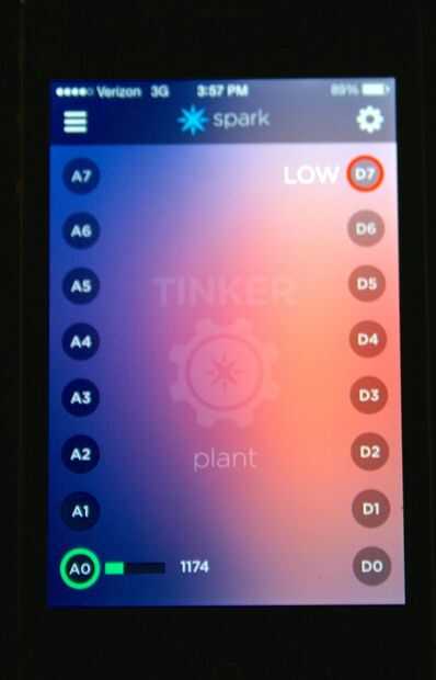 Mediante la aplicación de la chispa, elegir "Analógica lectura" para el pin A0. Si el número es alto (2500), luego de que su planta esté seca. Si está bajo (alrededor de 1100), la planta está húmeda.