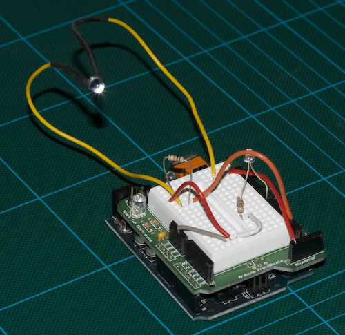 Después de haber decidido que podría conseguir una medida de alcance deseado para asegurarse de que podría conseguir cosas enganchadas en el Arduino. Así que el siguiente circuito y el código se armó y alambré el fotodiodo pin 2 (interrumpe uno de los pines por defecto para Arduino) y un LED al pin 7 para la depuración. Verificado que cuando he flasheado mi fuente de luz, la interrupción fue despedida y el LED encendido.