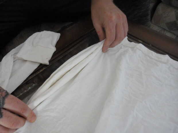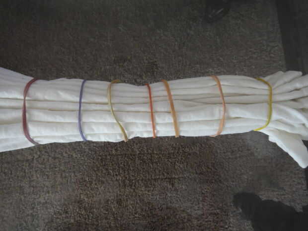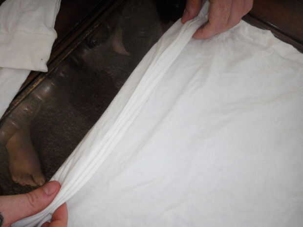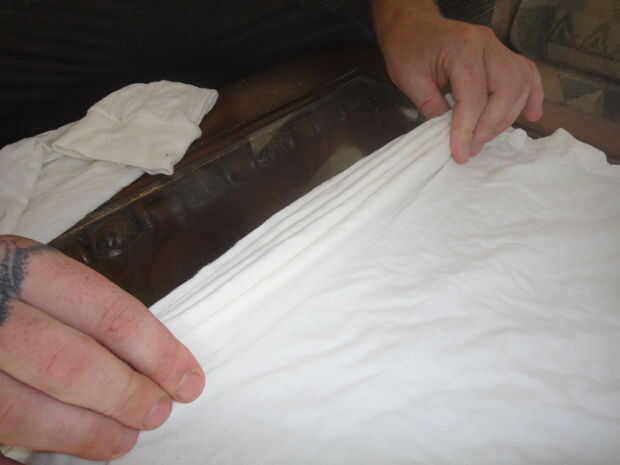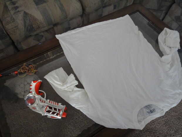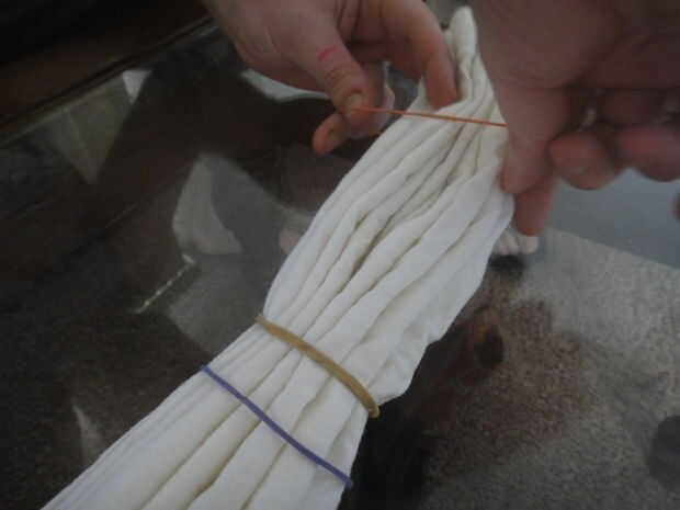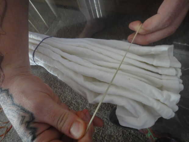 Doble la camisa como un acordeón. Recuerdo cuando solía hacer fans de papel como un cabrito, mismo pliegue en estas camisetas. Libremente cauchos de goma 7 después he doblado mi artículo. Coloque el artículo en una bolsa de supermercado para mantenerlo húmedo. Apartar su producto por ahora.