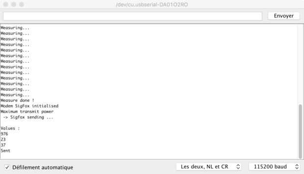 En la siguiente imagen, puede ver datos del sensor y luego Sigfox transmisión y finalmente dormir tiempo de 10 minutos antes de una secuencia de otros.