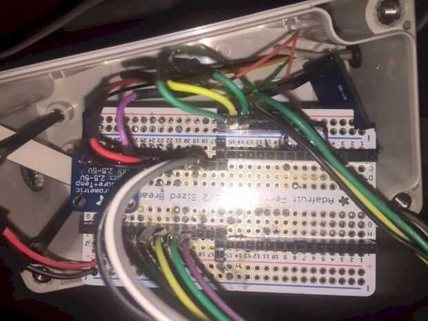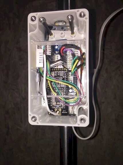 Usé un enclosure(120x65x40.5mm) ABS estanca de Hammond, 1554CGY número de parte. Disponible en RS components para £6,40. Gracias, pero mira la parte. Para la lente de la luz ambiente en la parte superior utilicé una "lente blanco panelmount indicador base" (también de RS en £4,60. Si puede mendigar una tapa de plástico transparente de algo más, haría muy bien. Usé clips de tubo simple tuberías de plástico blanco a la caja para el polo.