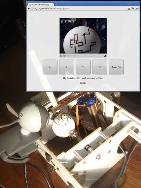 Generalmente, los EggBot es controlada por Inkscape ejecutando en el equipo host. Para dibujar una imagen en un huevo, Inkscape envía un montón de comandos a través de USB. Como lo EggBot es completamente open source, el formato de los comandos es fácilmente disponible. Esto nos permite controlar lo EggBot en "tiempo real", envío de comandos individuales haciendo clic en los botones en un navegador de Web remoto.