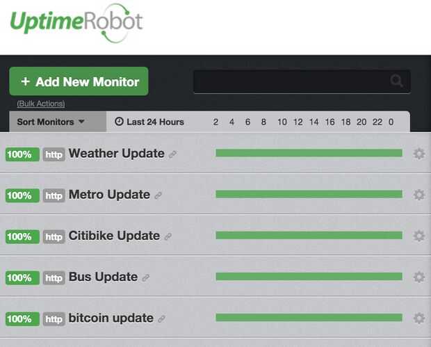 La última pieza del rompecabezas es asegurarse de que los datos secuencias de comandos se ejecutan tantas veces como quieras los datos a ser actualizados. (Tiene sentido actualizar los datos de metro cada minuto, pero no el tiempo, por ejemplo). Idealmente esto se maneja por configurar cronjobs en el servidor, pero para una rápida y opción usuario utilizamos un servicio llamado UptimeRobot. Con él, puede configurar las direcciones URL que se ping UptimeRobot intervalos que especifique. UptimeRobot automáticamente se hace peticiones, garantizando que los datos se ha actualizado. La imagen de arriba muestra una pantalla desde el dashboard de nuestro UptimeRobot.