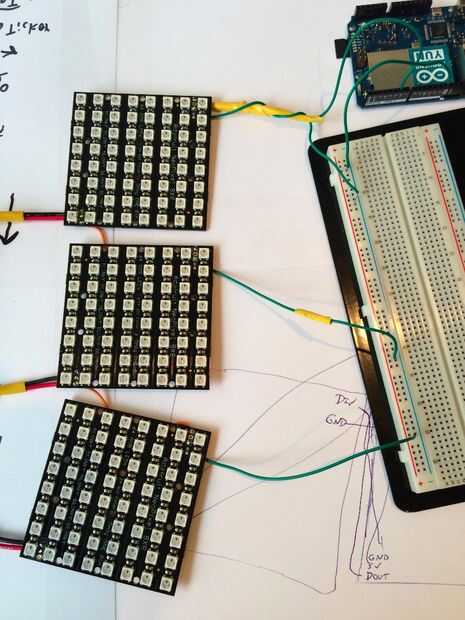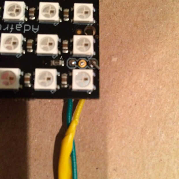 Cada tablero de NeoMatrix tiene un pad de datos en una esquina y una salida de datos en la esquina opuesta. Las matrices de aceptan una señal de 5v mediante un protocolo de alambre (no necesita saber mucho acerca de esto para empezar - las bibliotecas de código de NeoPixel NeoMatrix hacen el trabajo pesado aquí). Cuando alicatados, datos se pasan entre matrices de datos para datos. Una cosa a notar es el resistor colocado antes de la primera matriz de datos-en - supuestamente evita picos de voltaje queme el primer píxel.
