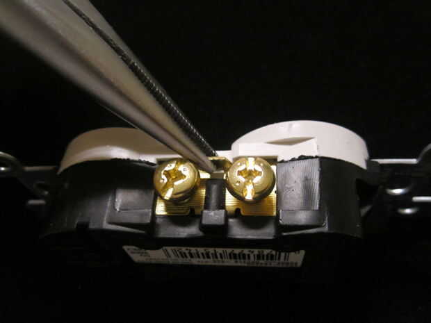 Tome una mirada cuidadosa en los receptáculos. Se dará cuenta de que por un lado tienes dos tornillos plateados para el hilo neutro (blanco) y en el otro lado tiene dos tornillos de oro para los cables (negro) caliente. Nos va quitar sólo la ficha del lado del oro (caliente). No retire las lengüetas del lado del plata.