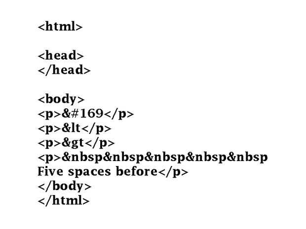 <= < (Menos que el símbolo)>= > (Mayor que el símbolo)©= © (El símbolo de copyright) = (Espacio no-frágil) (HTML elimina cualquier espacios adicionales que añades en tu escritura, por lo que en una etiqueta < p > Si usted tiene 10 espacios, sólo 1 espacio se verá como el resto se borran... Si desea que todas las personas a verse a continuación, agregue el & nbsp entidad a la etiqueta < p > y que agregará 1 espacio permanente a la etiqueta < p >...