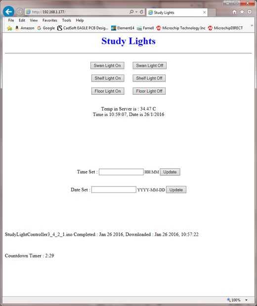 El cuadro de la página web es una pantalla del html entregado por el servidor a un cliente IE11. Permite al usuario cambiar las luces de encendido y apagado, fecha y hora actual. También muestra la versión de software actualmente en funcionamiento en el servidor y da una cuenta regresiva del tiempo restante antes de que la luz se apagará automáticamente. También se presenta una indicación de la temperatura interna de la caja de servidor.