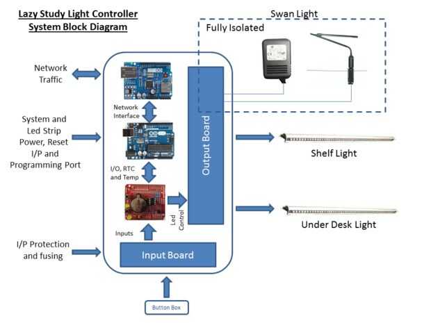 El controlador perezoso estudio comprende un Arduino Uno, Arduino Ethernet Shield y cierta electrónica apoyo para controlar salidas (las luces), leer entradas (HTTP cliente y botón de prensas), controlar la temperatura del recinto interno de servidor y proporcionar un reloj de tiempo real (RTC). Diagrama de bloques anterior.