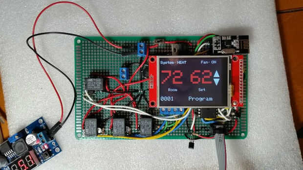 fuente de alimentación -mi casa está conectado con 27VAC a los termostatos, y para ejecutar el microcontrolador 1284 P, pantalla táctil LCD, sensor de temperatura y relés, necesito 3v3 DC. Utilizar un puente rectificador para convertir AC en DC y un convertidor buck DC hasta unos 5 voltios. (Nota: el convertidor del buck de LM2595 tiene un voltaje de entrada máximo de 40vdc, por lo que esto realmente es empujándolo. He tenido algunos problemas con algunos de estos.) Por último, ejecutar la salida a través de un regulador de voltaje para llegar a 3v3. La razón de que usar un convertidor buck antes el regulador de tensión el convertidor del buck es mucho más eficiente que el regulador de voltaje, para recibir menos energía desperdiciada que significa menos calor. Incluso podrían ser capaces de utilizar el convertidor buck para ir directamente a 3v3 y omitir el regulador, aunque no he probado, y es posible que la señal del convertidor buck podría no ser lo suficientemente suave para dar buen rendimiento con nRF24L01 +, que puede ser sensible a la suavidad de la fuente de alimentación. (Nota: la hoja de datos de LM1117 recomienda dos tapas con el regulador para suavizar la señal, y aunque parece que te va bien sin estos, te recomiendo usarlos. Voy a agregarlos al esquema posteriormente e incluirlos en mi propio construye futuro.)