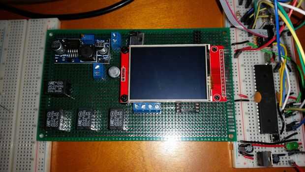 -> La pantalla LCD TFT pantalla utilizo generalmente tiene suficiente espacio libre que puede ir sobre otros componentes, incluyendo los terminales de tornillo y relés. Sin embargo, también tiene una ranura para una tarjeta SD en la parte posterior, y esta ranura para tarjetas SD no caben en los terminales de tornillo o relés. Historia divertida – durante la prueba final de un termostato, comencé a conseguir un comportamiento realmente flojo. La fuente de alimentación se apaga debido a un cortocircuito, fallaría el touchscreen de LCD y relés encender y apagar violentamente. Tras cierta depuración, me di cuenta de que la ranura para tarjetas SD en la parte inferior de la pantalla táctil del LCD era cortocircuito un número de pines en el 1284P cuando presionado en la pantalla táctil. Una pequeña cinta aislante sobre la ranura para tarjetas SD expuesta solucionó el problema.