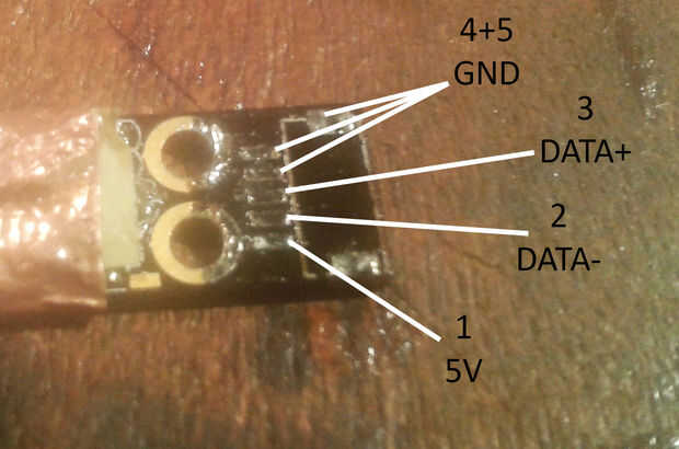 Para el siguiente paso un cable USB con cables de rayas es muy útil. Los pines se muestran en la imagen nr1.; simplemente soldar los cables a la cámara, el cable rojo es de 5V (yo uso una fuente de alimentación externa de 5v, ya que me permite establecer un límite de corriente y en el caso de un acceso directo no destruir mi motherboard de pc), el cable blanco es datos, el cable verde es data + y el cable negro y el apantallamiento son tierra. Puede conectarse a los pines GND, si utiliza una fuente externa de 5v que hay que unir también el conector de tierra de la fuente de alimentación a tierra.