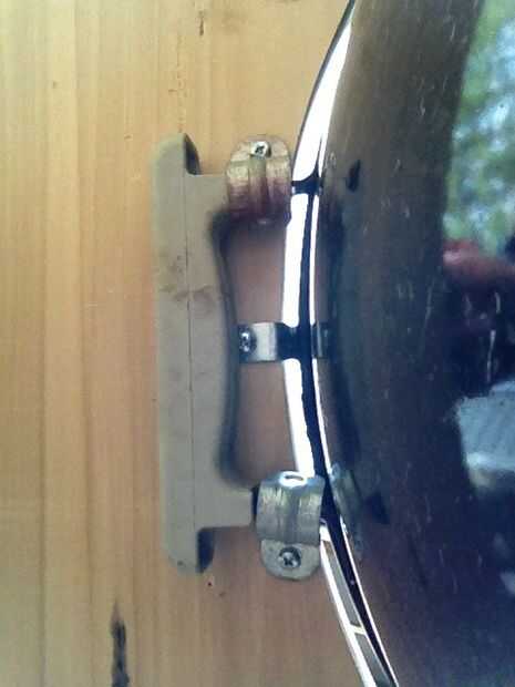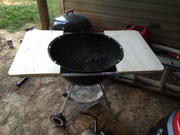 Coloque una de las mesas centradas sobre el mango de la parrilla como se muestra. Se trata de una foto de debajo. Usé dos correas más, para garantizar así que me puedo levantar de la mesa para mover la parrilla. Ajustar la madera a lo largo del conducto hasta que la tapa se cierre y sello. Puede que necesite volver a recortar la madera un poco para conseguir una ajuste de fábrica.