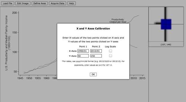 Una vez que se selecciona dos puntos, debe aparecer la pantalla de "X y Y hachas de calibración". 1950/01 para el punto 1 y el 2010/01 para el punto 2 de la entrada para los campos del eje x, (/ 01 de enero de 1950/2010 ~ WebPlotD es inteligente con las fechas!). Para los campos de eje de entrada de 50 para el punto 1 y 150 para el punto 2.