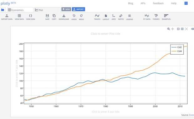 Ahora que tienes todos los datos delante de usted, haga clic en "Hacer un complot" y seleccione "Línea de parcelas" a lo largo de la parte superior Plotly. La primera columna debe ser el x (fechas) en azul, la segunda y (índice), el tercero otra columna de fechas en naranja y la cuarta otra columna de índice. Una vez seleccionadas las cuatro, haga clic en el botón azul a la izquierda que dice "Trama de la línea."