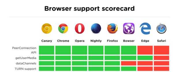 WebRTC es adoptado ampliamente por navegadores como Chrome y Firefox, pero hay muchos navegadores en el que ciertas características no funcionan. Ver una lista de navegadores soportados aquí.